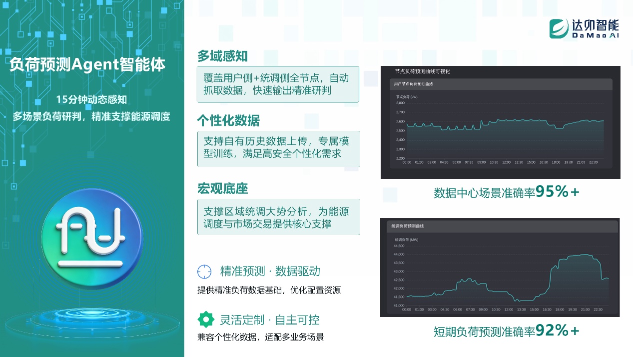 負(fù)荷預(yù)測Agent :針對數(shù)據(jù)中心、工業(yè)負(fù)荷等高精密場景實現(xiàn)動態(tài)滾動預(yù)測,核心場景預(yù)測準(zhǔn)確率穩(wěn)定保持高位,精準(zhǔn)捕捉算力波動與用電峰谷變化,為調(diào)度交易筑牢數(shù)據(jù)基礎(chǔ)。