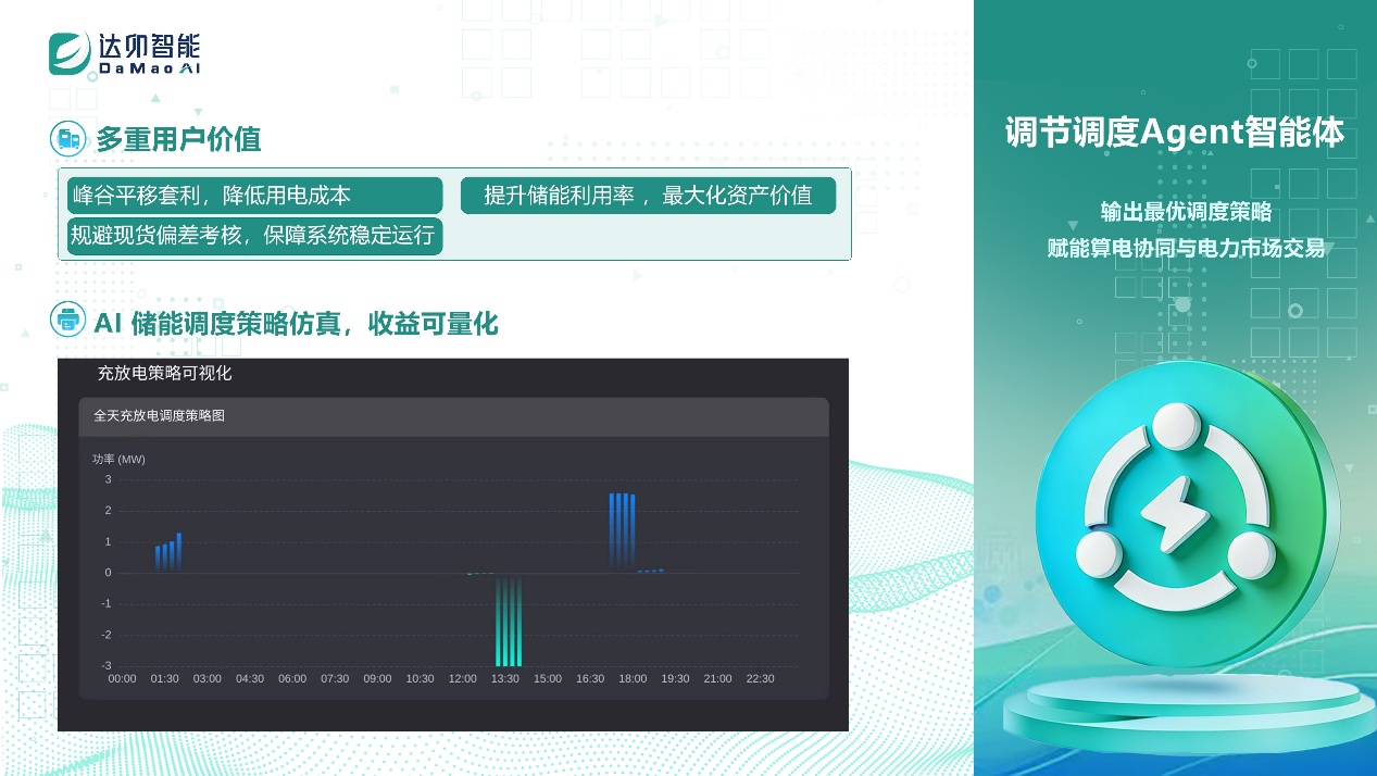 調(diào)節(jié)調(diào)度Agent :承擔(dān)算電協(xié)同與儲能管理核心職能,自動生成最優(yōu)充放電策略,實現(xiàn)峰谷套利、負(fù)荷平抑,最大化儲能資產(chǎn)價值,并保障負(fù)荷運行與電網(wǎng)接入雙穩(wěn)定。