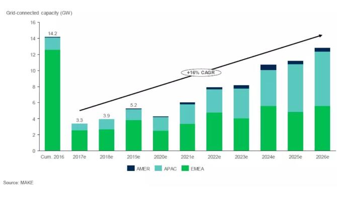 預計2018年,全球共計將新增3.9GW海上風電并網容量,中國海上風電項目的施工速度加快、歐洲市場進一步的成熟發展將成為主要推動力。MAKE預計2017-2026年間,全球海上風電產業將穩健發展,復合平均增長率將達到16%。