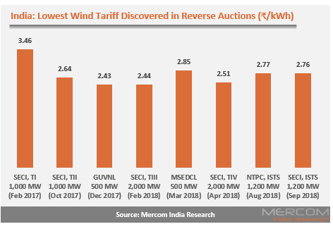 在印度太陽能公司(SECI)進行的1200兆瓦Tranche-V風力拍賣中,出現了?2.76(~0.038美元)/千瓦時的中標關稅。