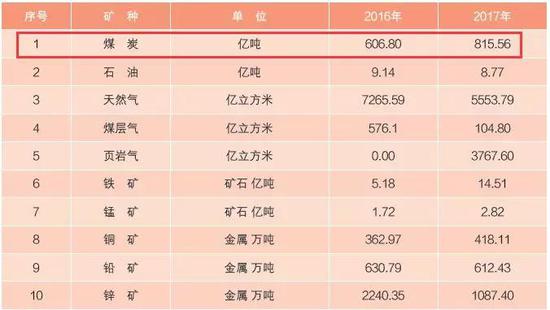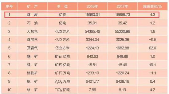2017年,全國新發現礦產地109處,煤炭有8處;勘查新增資源量超過50億噸煤田有3處。